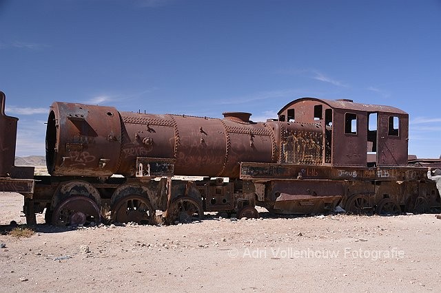 Oude stoomlocomotief op het treinenkerkhof bij Uyuni.