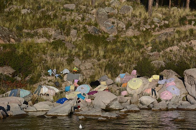 De was ligt te drogen op de oever van het meer.