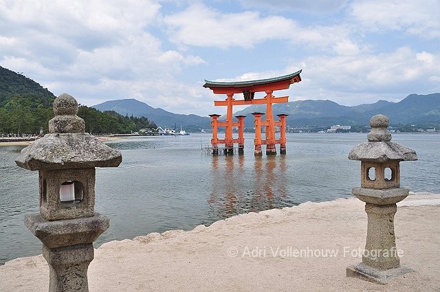 De rode torii, helaas in de steigers, is 16 m. hoog en ligt een stuk voor de kust van Miyajima, dat tempeleiland betekend.